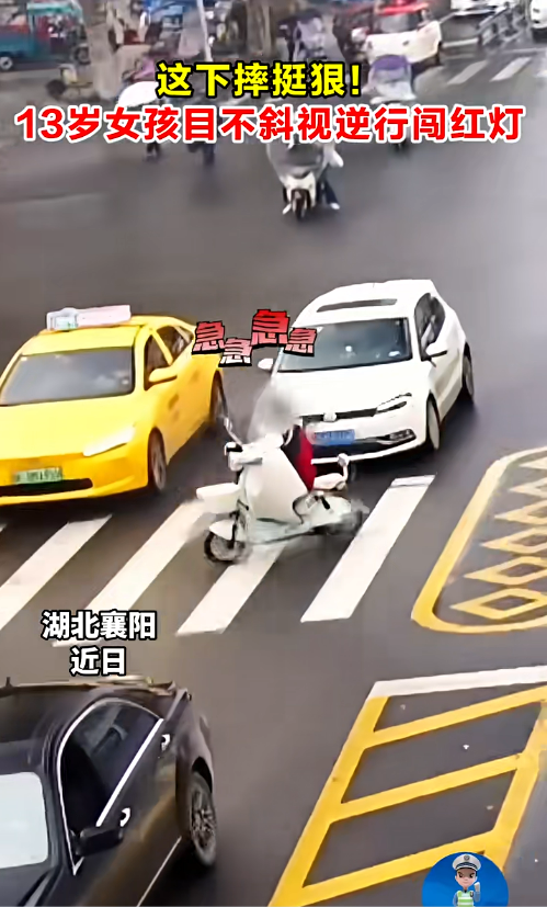 据介绍,事发时,这名13岁的女孩骑着电动自行车逆行来到路口,不仅无视红灯闯灯进入路口,而且速度还越来越快,结果一头撞上一辆绿灯时正常行驶的出租车。