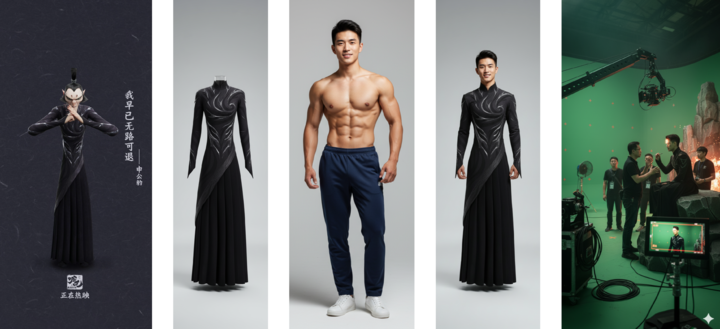 这里我们找了一张申公豹的剧照图片,并且用 nano banana 生成了一个有着八块腹肌的男子形象,(自己找演员,当然找帅一点的来演),让他穿上了角色的衣服。