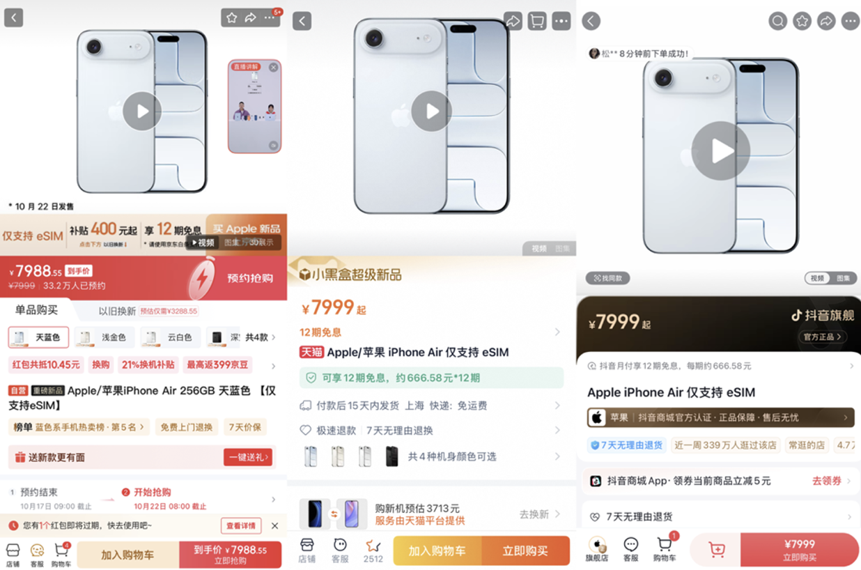 iPhone Air目前正在各大平台预售,10月22日正式开售。天猫和抖音官旗目前价格都是7999元起,并无任何优惠,但京东可领400元换新补贴,整体算下来能便宜400元。iPhone 17系列,天猫可叠加300元惊喜券,抖音并无任何优惠,京东可在300元惊喜券基础上再叠加PLUS优惠,还能再便宜几十不等。
