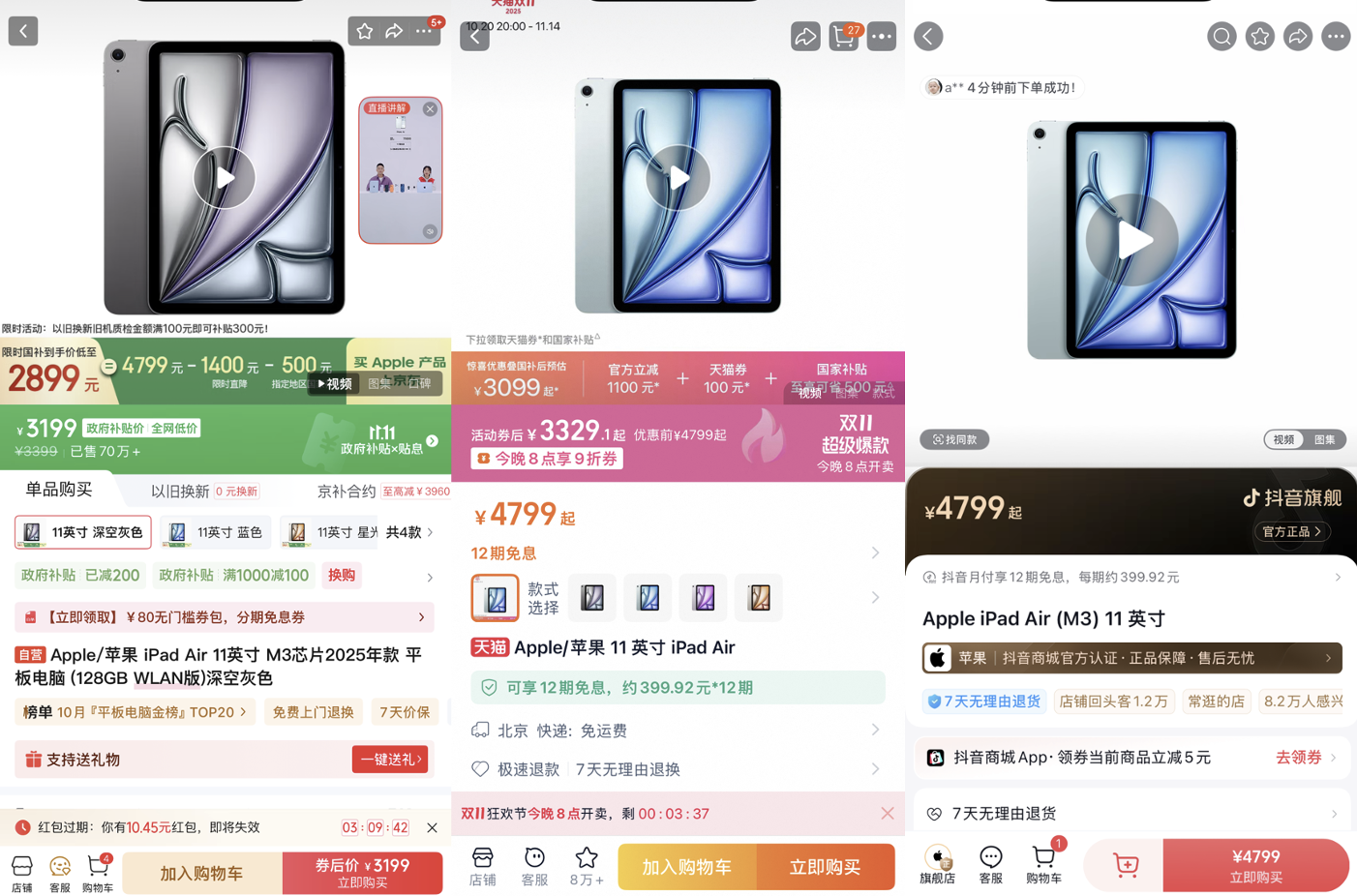 iPad Pro 11英寸M5(256G)虽然是新上的品,天猫可使用500元消费券到手价是8499元,抖音没有优惠到手价8999元,但京东可领400元消费券,PLUS会员还能叠加300元的专属券,最终到手只需要8299元,足足比抖音官旗便宜了700元。另外iPad Air 11英寸(128G)也有大几百的价差,天猫官方立减1100元,还可叠加100元天猫券以及至高500元国家补贴,最终到手价是3099元起,抖音官旗并无优惠到手还是4799元,京东则直降1400元,再加上500元国家补贴,最终到手只需2899元,比天猫还便宜200元。