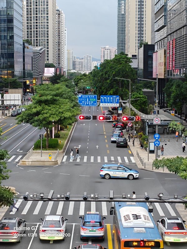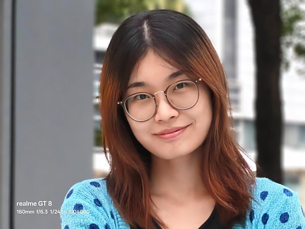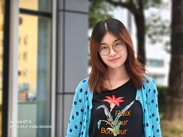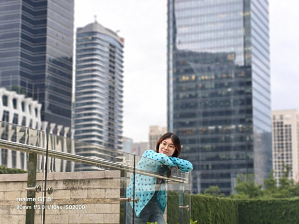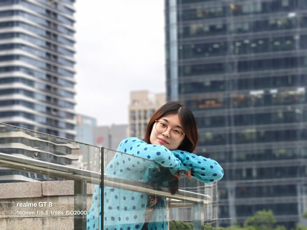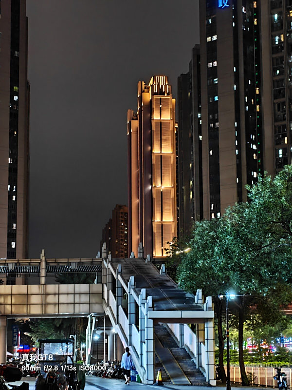 真我GT8 搭载的5000 万超光影潜望长焦(1/2.76'')是同价位唯一配备潜望长焦的机型,3.5 倍光学变焦的黄金焦段,配合 OIS 光学防抖,细节清晰,突出建筑线条美感,避免普通广角拍摄的畸变问题。同时,3.5倍焦段压缩了背景空间,人物与街道背景的分离度极高,虚化过渡自然,发丝边缘无明显涂抹感,肤色还原也更接近真实。拍摄夜间建筑群时,灯光无眩光,暗部的窗格细节清晰可见。