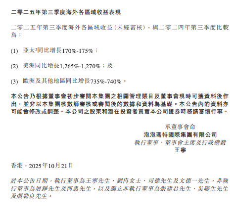 海外市场的表现更为突出。泡泡玛特称,其海外收益同比增长约365%至370%。分区域来看,美洲地区同比增1265%-1270%,是公司全球扩张的主要推动力;欧洲及其他市场增长约735%至740%,亚太地区增长约170%至175%。