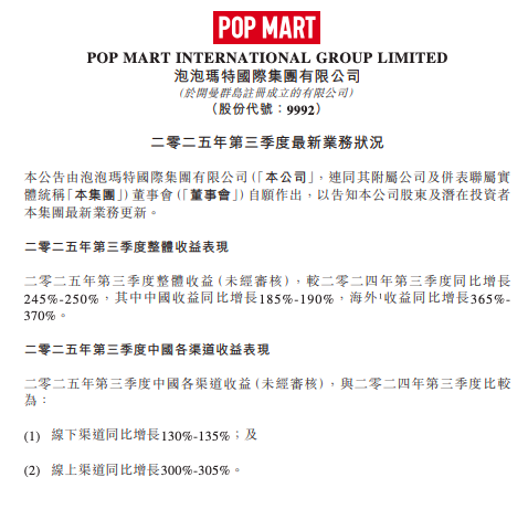 【亿邦原创】10月21日,泡泡玛特国际集团有限公司在港交所发布公告,公告显示,公司第三季度收益同比增长约245%至250%,受益于中国及海外市场的同步扩张。