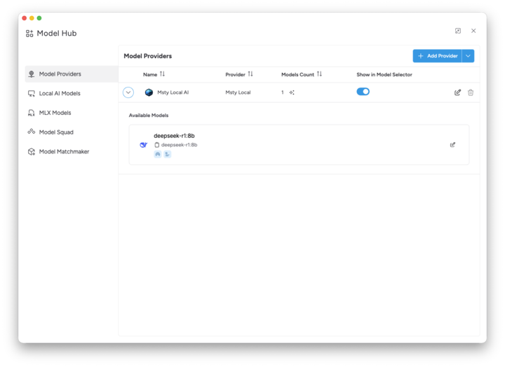 以苹果在官方视频中演示过的 Msty Studio 为例,作为一款功能类似 Ollama 但模型库更丰富的「开源模型本地化部署工具」,Msty Studio 最主要的功能,就是可以让你的 Mac 在断网情况下跑语言模型。