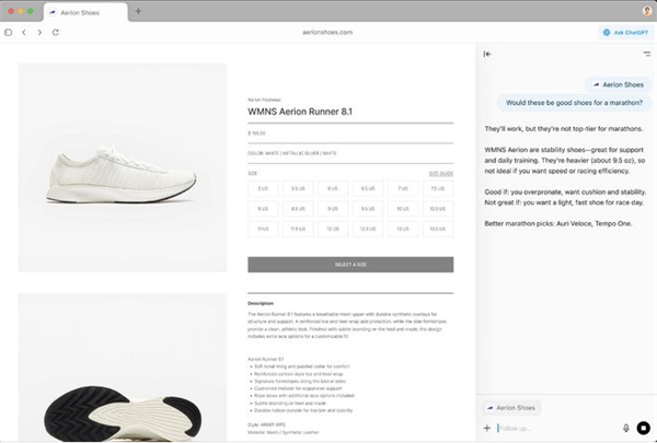 该浏览器以ChatGPT为核心,用户访问任意网页时,都能通过点击“Ask ChatGPT”在侧边栏与AI实时互动。
