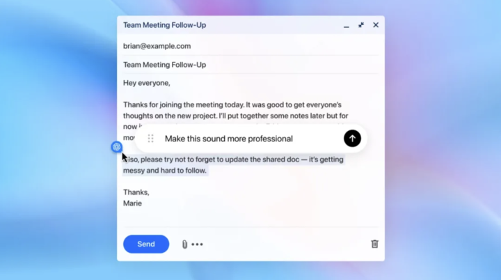 而同样是在今天的演示中,OpenAI 内部员工在撰写给团队设计师的邮件时,直接选中一段文字,点击 ChatGPT 按钮并输入「优化语言」指令。