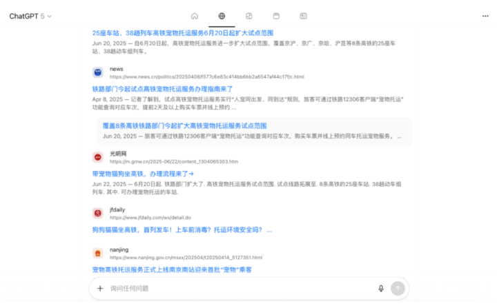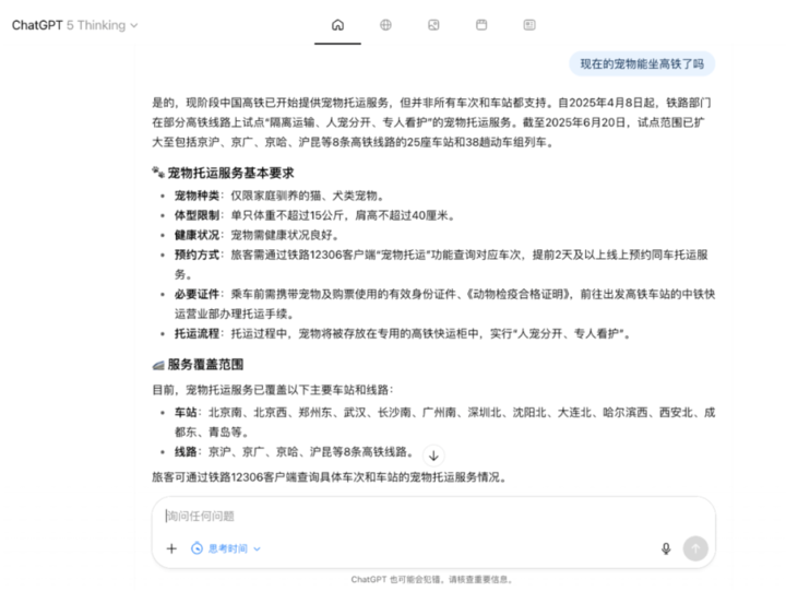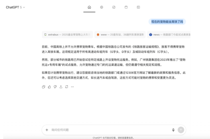 举个例子,我问「现在的宠物能坐高铁了吗」,明明点开搜索源就能看到官网写着允许的链接,但 GPT-5 Instant 愣是没整合出正确答案。