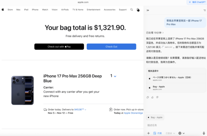 就实际体验而言,比如我提个需求「帮我在苹果官网买部 iPhone 17 Pro Max」,它在 Agent 模式下执行任务时会显示「接管控制」按钮和红色的「停止」按钮,可随时接管。