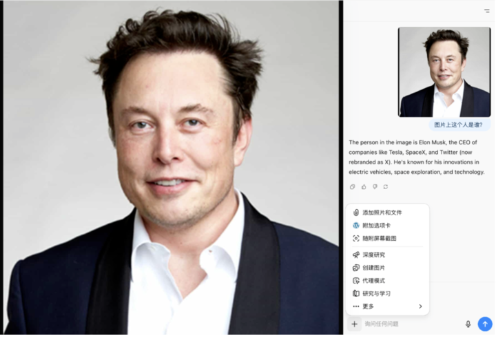 另外,Atlas 还支持截图,点右侧的 + 号,选「随附屏幕截图」就能上传,我找了张马斯克的照片,照着这么操作一遍,它也能准确认出是马斯克。