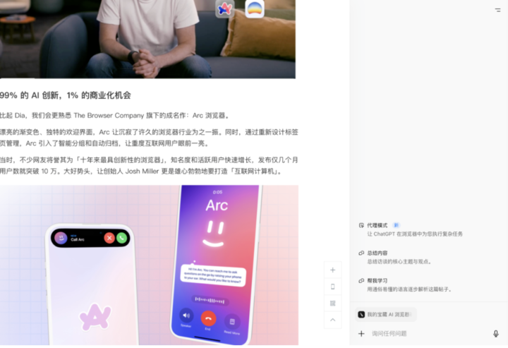 比如划个词,网页右侧就能直接查找或解释,或者让它给文章来个摘要。
