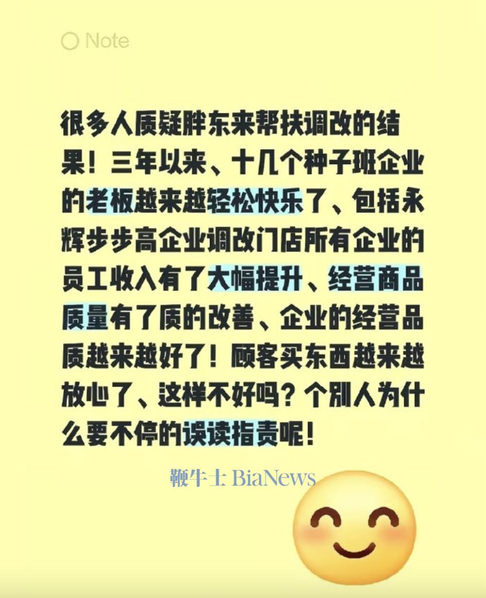 昨日,于东来曾发文回应帮扶调改结果被质疑,于东来称,“很多人质疑胖东来帮扶调改的结果!三年以来、十几个种子班企业的老板越来越轻松快乐了、包括永辉步步高企业调改门店所有企业的员工收入有了大幅提升、经营商品质量有了质的改善、企业的经营品质越来越好了!顾客买东西越来越放心了、这样不好吗?个别人为什么要不停的误读指责呢!”