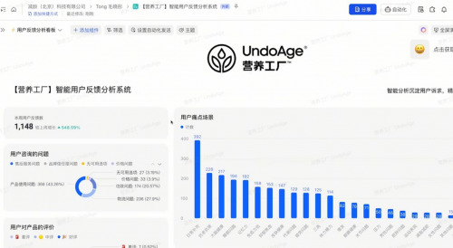 飞书多维表格与AI的介入彻底改变了这一局面。通过实时上传用户聊天记录至表格,AI 可自动分析用户意图、需求及问题解决情况,并统计客服回答质量与数量。更关键的是,管理层可通过多维表格的实时仪表盘,24 小时查看用户关注焦点、产品咨询热度、问题类型分布等核心数据。“这个工具让‘听用户声音’从‘事后补课’变成‘实时洞察’,我们能更快调整产品和服务策略。”朱萧木表示,“创业圈常说消费品牌要做好‘做产品-听反馈-改产品’的循环,飞书多维表格就是我们的‘循环加速器’。”