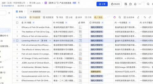 飞书多维表格的 AI 文献阅读功能成为破局关键。团队将 PDF 论文批量上传后,系统可自动完成英文摘要翻译、提取试验类型(双盲/单盲)、研究对象(人体/动物)、结论正负性等关键信息,并生成结构化表格。“我们一个华西背景的同事,能把相关类目高影响力的论文,一次几十篇‘一波扔进去’,生成巨大数据库,还能按普通用户、专业用户需求分级输出内容。”朱萧木感慨,“我们博士团队的速度都赶不上它!现在用户问‘鱼油好在哪’,我们直接甩论文,‘科学家说的才算’——这才是最硬核的信任背书。”