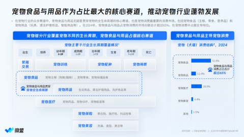 并且,在宠物行业的众多赛道中,宠物食品与用品是贯穿宠物的全生命周期的核心赛道,也是宠物消费最重要的消费市场。2024年,宠物食品与用品占宠物消费的市场份额合计超过65%,在宠物消费中占据主导地位。