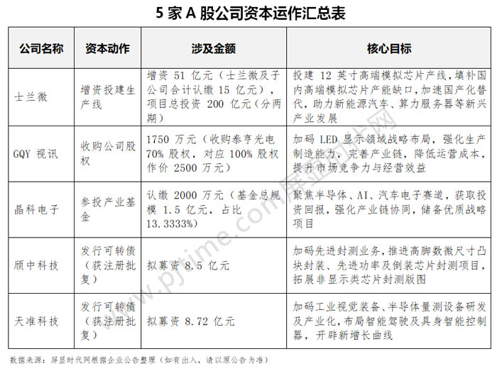 当全球半导体产业进入 “技术集群突破 + 区域生态协同” 的关键阶段,中国科技企业的资本布局正精准踩准产业链升级的脉搏。近日,士兰微、GQY 视讯、晶科电子、颀中科技、天准科技五家企业同步披露重磅资本动作:从士兰微联合多方砸下 200 亿元投建 12 英寸高端模拟芯片产线,填补国产产能空白;到颀中科技、天准科技合计斩获超 17 亿元可转债批复,加码先进封测与半导体量测技术攻关;再到 GQY 视讯收购强化 LED 显示产能、晶科电子参投基金布局 AI 与汽车电子 —— 一场覆盖 “芯片制造 - 封装测试 - 终端应用 - 生态投资” 的全链条协同战已然打响,为中国显示与半导体产业突破海外技术封锁、构建自主可控生态注入强劲动能。