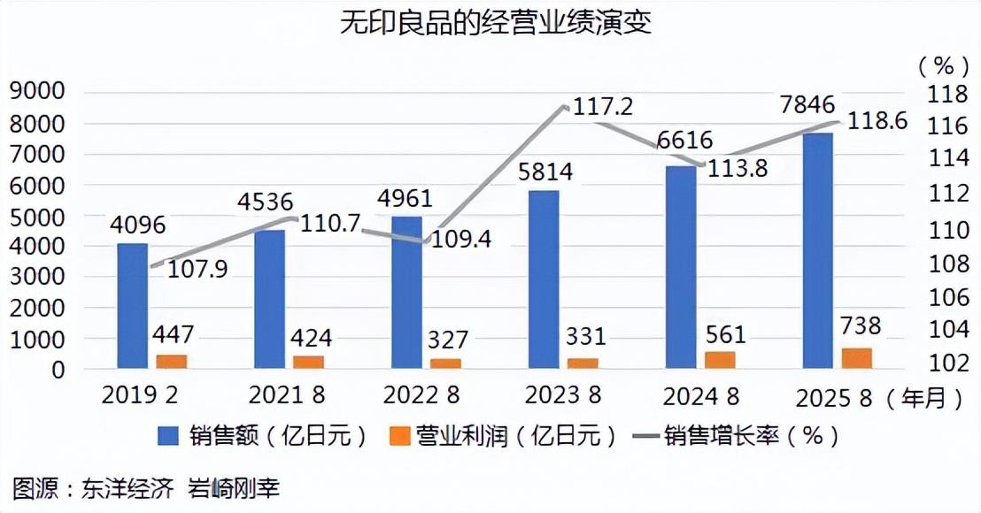 数据显示,无印良品本财年(2024年9月至2025年8月)增收增益,销售额为7846亿日元(约合人民币369.86亿元),同比增长18.6%。营业利润为738亿日元(约合人民币34.79亿元),同比增长31.5%,大幅超过计划预期。