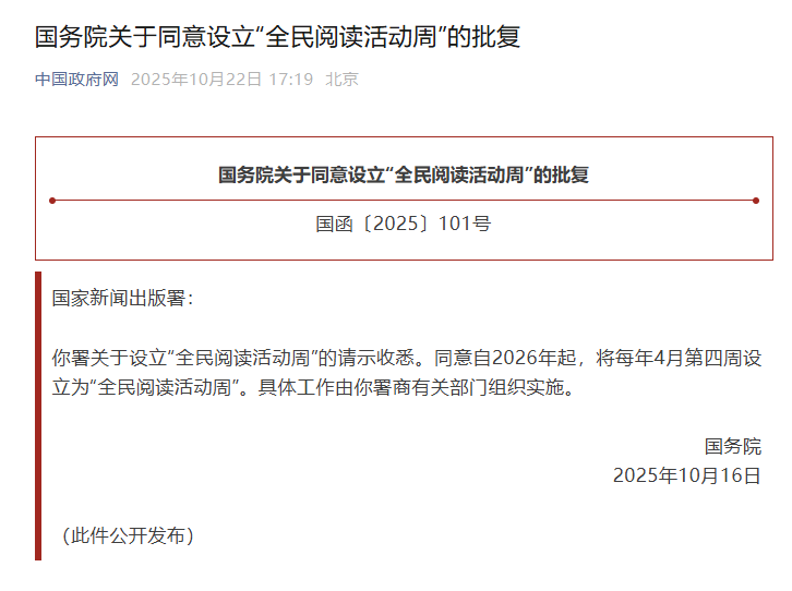 新京报讯 据中国政府网消息,国务院批复同意自2026年起,将每年4月第四周设立为“全民阅读活动周”。