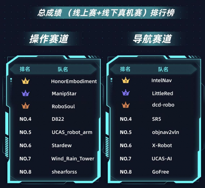 而荣耀机器人团队凭借“仿真预训练 + 真机轻量化微调”的路径,不仅有效攻克了这两大难题,实现高效部署与高精度执行,还在1小时的线下决赛中展现出“开箱即用”的硬实力——机器人全程稳定运行,任务完成率远超第二名30个百分点,最终以绝对优势摘得冠军,充分彰显出团队领先的具身AI工程落地部署能力,也为具身智能技术从实验环境走向真实应用按下了“加速键”。