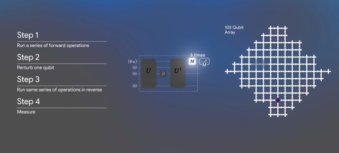 而此次谷歌披露的新技术Quantum Echoes(量子回声)的运作方式类似一种高度先进的回声。通过向量子系统(Willow 芯片上的量子比特)发送精心设计的信号,扰动其中一个量子比特,随后精确逆转信号的演化过程,以 “聆听” 返回的 “回声”。这种量子“回声”的特别之处在于,它会通过相长干涉得到放大 —— 这是一种量子波叠加后强度增强的现象,这使得测量具备极高的灵敏度。