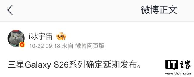 10 月 23 日消息,消息源 @i冰宇宙 昨日(10 月 22 日)发布微博,称“三星 Galaxy S26 系列确定延期发布”,但微博中并未提及延期时间。