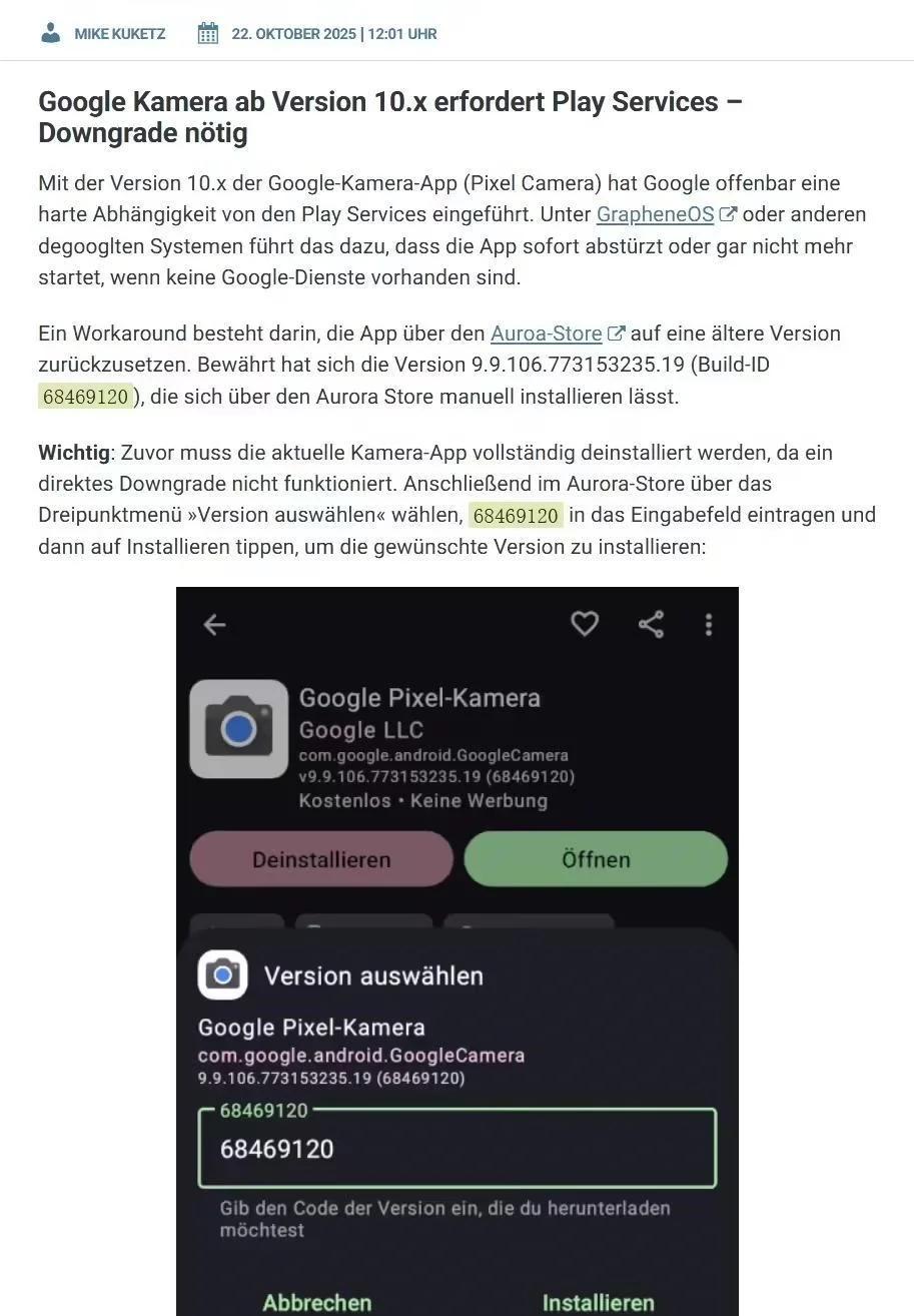 不过目前还是有方法让 Pixel 相机应用在 GrapheneOS 上正常运行,比如用户可以将应用回退至 9.9.106.773153235.19(Build ID 68469120)版本,这个版本的 Pixel 相机完全不检测 Play 服务,可以正常使用。