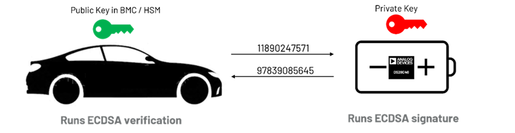 基于椭圆曲线数字签名算法(ECDSA)的非对称方案,它在模组中使用私钥,在汽车侧 BMS上使用公钥。