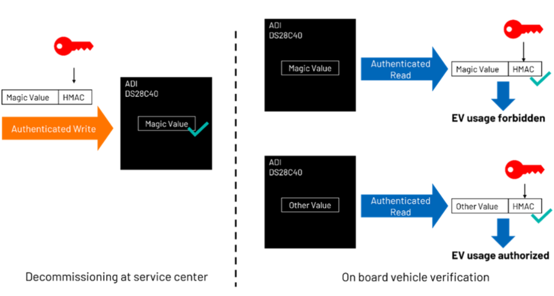 为此,必须确保这些退役电池在其性能已不符合电动汽车要求后,不再重复用于其他车辆。也就是说,应以安全且不可逆的方式对电动汽车电池模组进行退役处理。除了电池模组认证之外,DS28C40、DS28E40 和 DS2478 还支持安全退役。一个很直观的想法是:我们可以在电池模组附加的芯片中存储一个“魔法值”(即任意已知的预设值),利用它来判断电池模组是否仍可用于电动汽车,还是已经退役。这种简单方法只有在满足以下条件时才有意义: