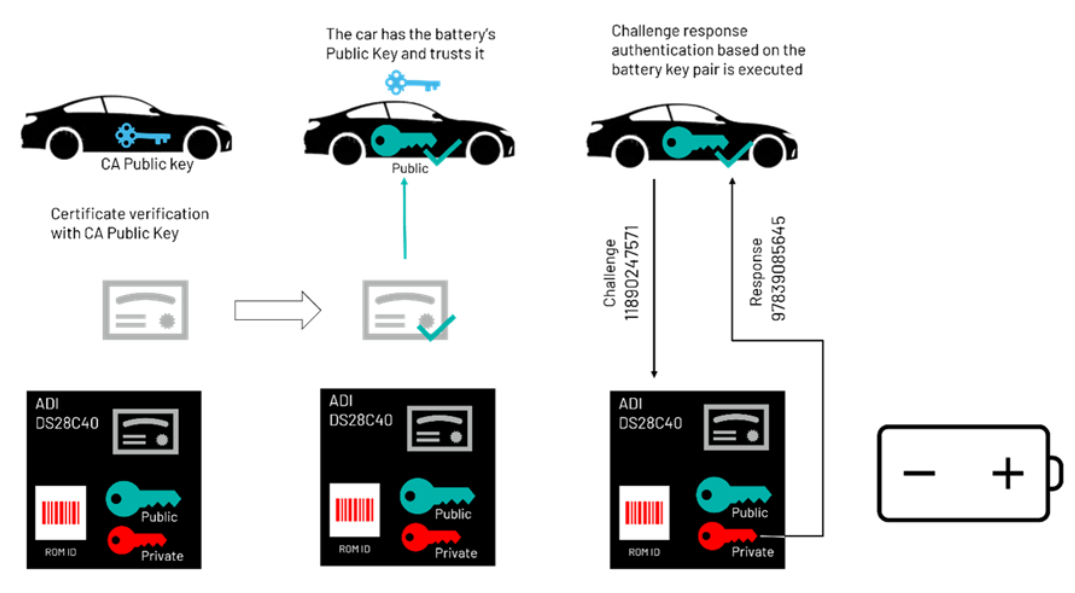 安全与防护往往相互依存。就汽车而言,如果关键系统的安全性得不到保障,车辆的整体安全性就可能被削弱。以锂离子电池为例,产品制造缺陷可能引发火灾和爆炸。与 OEM 认证产品相比,未经授权的制造商所生产的电池价格可能较低,但在结构用料和安全检测方面往往不达标。大多数电池虽不至于引起火灾,但性能下降可能间接损害 OEM 的品牌声誉。正品电池在汽车中结束使用寿命后,通常仍具备“第二次生命”的潜力,可重新部署于固定式储能中心。为了防止正品 OEM 电池被重新用于其他车辆,应通过不可逆的报废程序将其退役。数字认证技术让汽车能够识别所连接电池的真伪,确保仅使用正品电池,拒绝假冒产品。ADI 公司的 DS28C40 和 DS28E40 认证器就属于此类设备,不仅提供认证功能,还能将电池使用记录安全存放在存储器中,实现可追溯性。制造信息、服务信息和退役状态等关键信息,可以轻松存储在由认证器数字签名的安全一次性可编程(OTP)存储器中。