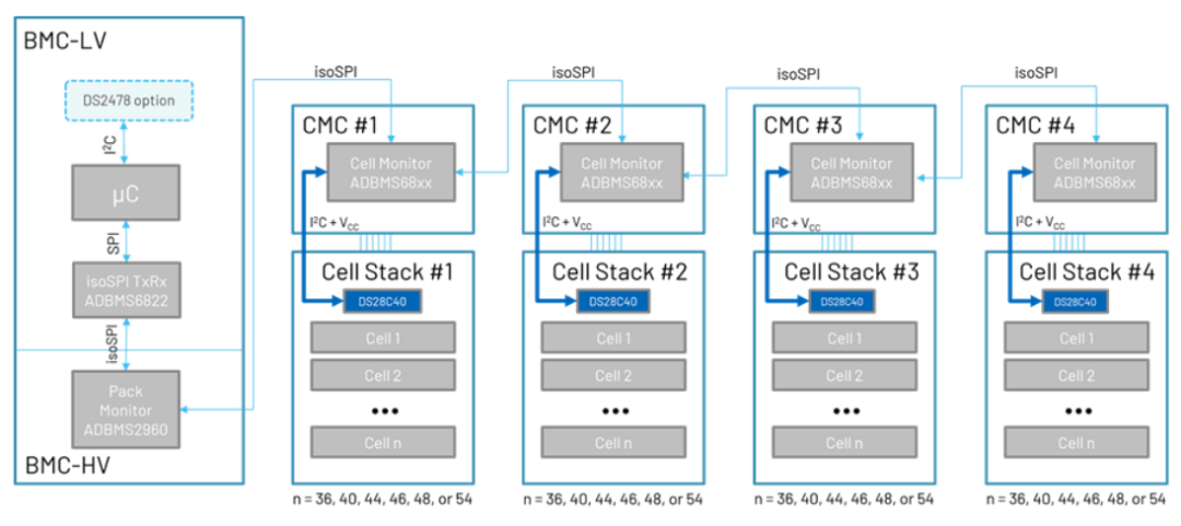 在 ADI 有线 BMS 中,电池管理控制器通过 ISO SPI 与电池模组通信。ISO SPI 协议允许两个隔离器件进行串行外设接口(SPI)通信。ISO SPI 具有 I2C 隧道能力,支持与 DS28C40 连接,如图 9所示。通过这种通信媒介,BMC 可以单独验证每个电池模组的身份。有关 ISO SPI 的更多信息,请参阅本文。