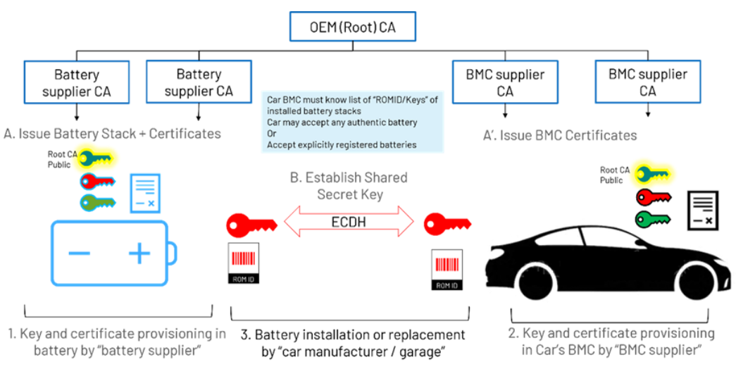 在此方案中,密钥和证书分别安装在电池和车辆中。证书受相关认证机构的信任。认证过程可能涉及多家电池供应商的认证机构及多家电池管理控制器一级供应商。