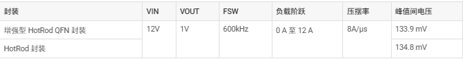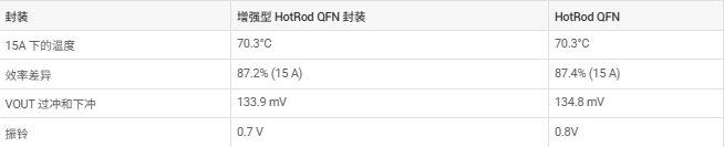 在既定的工作条件下,与 HotRod 封装相比,增强型 HotRod QFN 封装的性能未出现明显下降。经过非常仔细的检查后发现,功率耗散会显示出 50mW 的差异,但仅在 15A 负载电流下如此。另一方面,增强型 HotRod QFN 封装可将开关节点振铃减少 0.1V 并将负载瞬态输出电压过冲和下冲减少 1mV,相对来说可忽略不计。表 8-1 汇总了结果。