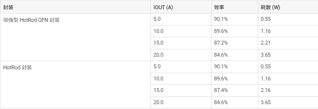 表 5-1 比较了两种封装的效率和功率耗散情况。我们对每个器件的 VCC 施加了 3.3V 偏置电压,以便消除内部线性稳压器所产生的任何损耗,该稳压器负责为 IC 供电。线性稳压器损耗可能因批次间的工艺变化而异;您可以施加外部 3.3V 偏置电压并获得最接近的效率比较结果,从而消除这些损耗。每种封装的效率和功率耗散结果非常类似,但 HotRod 封装设计的功率耗散低 50mW,或效率高 0.2%,这仅适用于 15A 电流情形,可以忽略不计。增强型 HotRod QFN 封装未带来任何改进,相比 HotRod 封装仅出现轻微的效率下降。