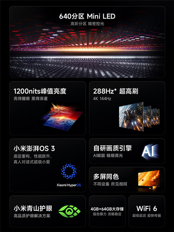 配备自研画质引擎、小米青山护眼技术,做到了20KHz万级超高频调光,频闪几不可见。