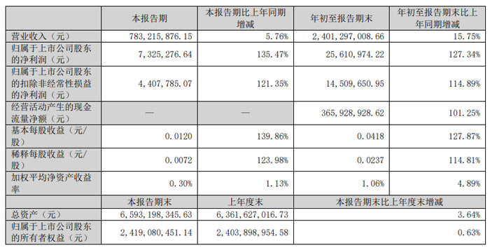 每股收益方面,本报告期基本每股收益 0.012 元,同比增长 139.86%;年初至报告期末基本每股收益 0.0418 元,同比增长 127.87%,股东回报水平同步提升。
