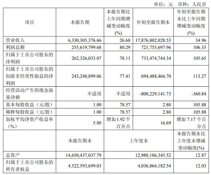 年初至报告期末(1-9 月),公司累计营业收入 178.77 亿元,同比增长 34.96%;累计归属于上市公司股东的净利润 7.33 亿元,同比激增 105.65%;累计扣非净利润 6.94 亿元,同比增幅更高达 113.27%,主营业务盈利能力持续强化。