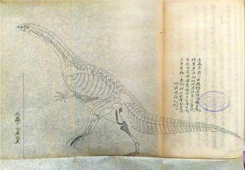 杨钟健手绘的“许氏禄丰龙”化石骨架重建图。