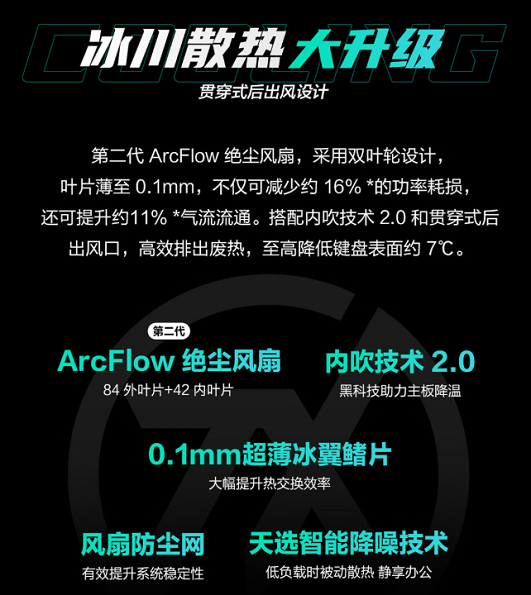 良好的散热能力,是硬件“火力全开”的必要条件。华硕天选6 Pro锐龙版所搭载的冰川散热迎来全面升级,引入全新内吹技术2.0与贯穿式后出风设计,提升散热效率的同时,有效避免热风吹手;搭配第二代ArcFlow绝尘风扇+0.1mm超薄冰翼鳍片,即使长时间高负载运行,也能时刻保持“冷静”,性能持续满血输出。