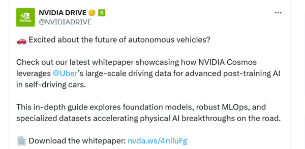 英伟达在社交媒体X平台上发布消息,详细介绍了两家公司如何携手推进自动驾驶技术的发展。