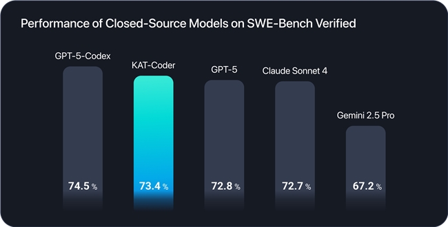 ● 性能领先:在权威的 SWE-bench Verified 榜单中,KAT-Coder-Pro V1 以 73.4% 的问题解决率,超越了 GPT-5 与 Claude Sonnet 4,展现出其在代码生成和理解方面的顶尖实力,已成为 2025 年 AI 编码领域的有力竞争者。