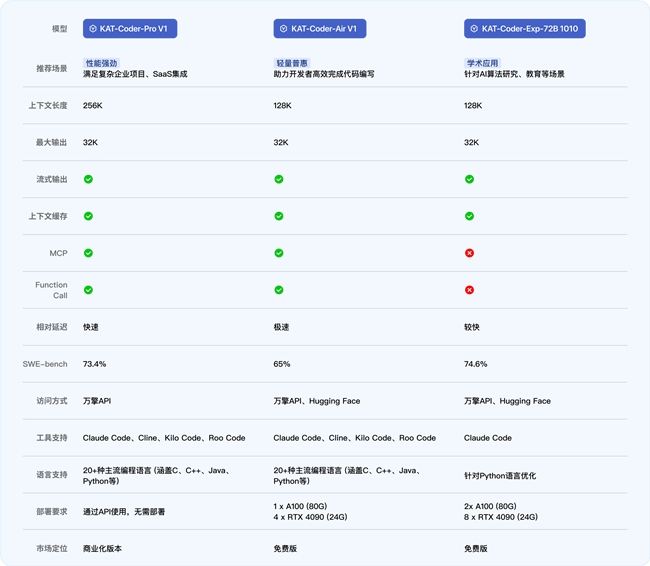 KAT-Coder 系列模型旨在以卓越的性能与极具竞争力的成本,三款不同定位的模型将满足各领域开发者的需求: