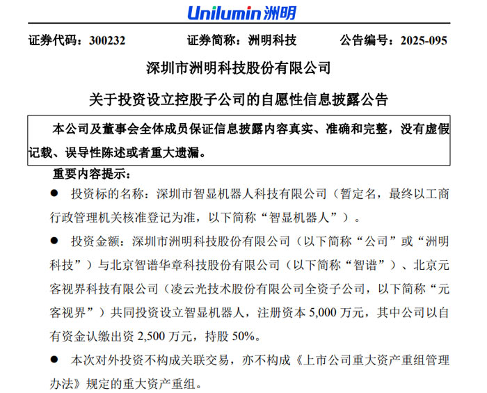 2025 年 10 月 24 日,深圳市洲明科技股份有限公司(证券代码:300232,简称 “洲明科技”)发布自愿性信息披露公告,宣布与北京智谱华章科技股份有限公司(简称 “智谱”)、北京元客视界科技有限公司(凌云光技术股份有限公司全资子公司,简称 “元客视界”)达成战略合作,共同投资设立深圳市智显机器人科技有限公司(暂定名,最终以工商核准为准,简称 “智显机器人”)。此次合资公司注册资本 5000 万元,三方将整合核心技术优势,构建 AI 智能终端创新生态,推动智能体在教育、会议、文旅等场景的 “显示具身化” 落地,助力行业智能化升级。