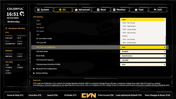 搭载新一代图形化BIOS,不仅重新设计EZ主页,将常用的一键EXPO、PBO预设、开机优先项等功能集中于EZ首页,还在高级菜单中加入了CPU LOADLINE防掉压选项、异步超频选项、丰富的内存参数调整。