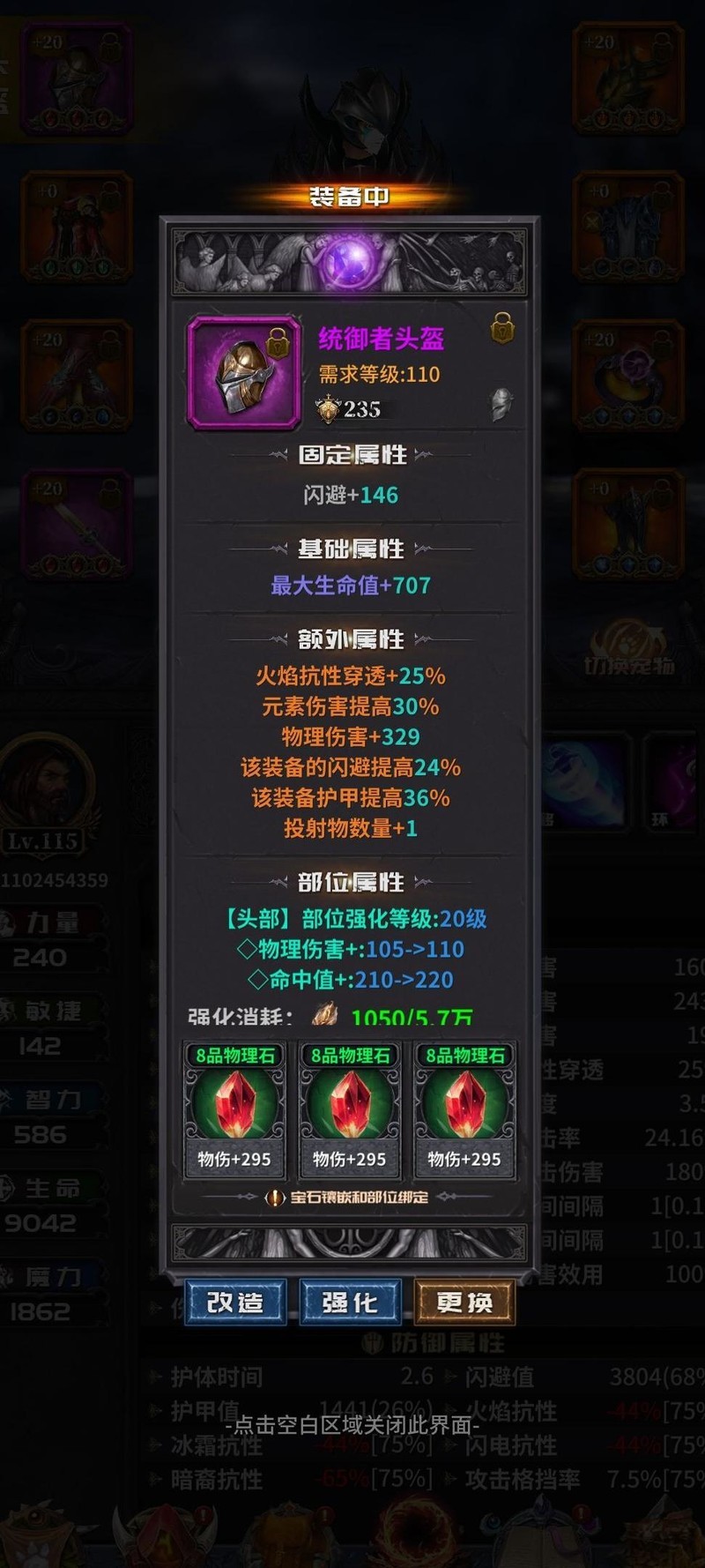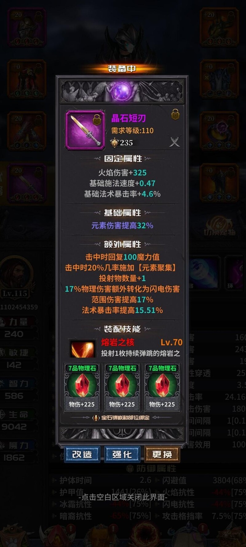 花费四百余块石头,重置了115级裤子与鞋子戒指,75级项链及手部装备,顺带清洗武器头盔,提升投掷类武器数量,并附加击中回蓝属性。