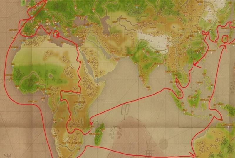 从广州启程,经占城抵达吞武里,穿越马六甲海峡,由亚齐出发直航莫桑比克。随后取道小路前往锡拉库萨,开启地中海逆时针小环线,终点为塞利维亚。地中海通往欧洲的航线中,仅有波尔多与南特具备贸易价值,其余港口可忽略。欧洲小圈运行至汉堡即可折返,东欧地区经济落后,除鸡血寿山石和粉钻外无值得交易货物,不建议前往。自汉堡出发驶向阿尔金,开启非洲象牙与钻石贸易之旅,终点为索法拉。此后垂直向右航行,抵达平贾拉(疑似澳洲)采购粉钻,继而一路北上,最终直达东京。