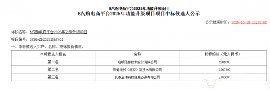 日前,中国一汽“E汽购电商平台2025年功能升级项目”发布了中标候选人名单,项目最终由报价最高的厂商拿下,具体是什么情况?