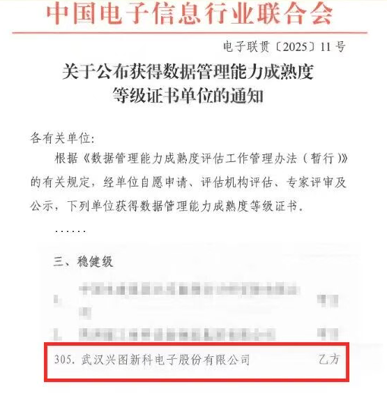 近日,依据国家标准《数据管理能力成熟度评估模型》(GB/T 36073-2018,简称DCMM),经中国电子信息行业联合会评定,兴图新科成功通过国家数据管理能力成熟度稳健级(三级)认证,标志着公司在数据治理体系构建和数据资产运营等方面已达到国家标准,数据管理能力迈入行业前列。