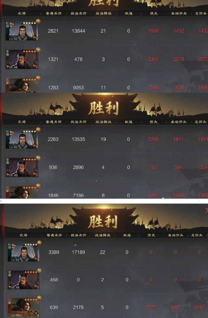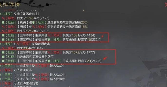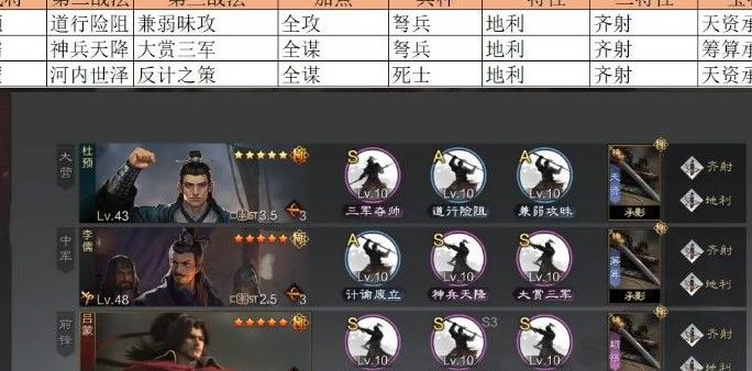 综合来看,同属S级战法,三军整体表现优于众谋。虽然两者均为五格射程,可针对敌方大营发动攻击,且每次伤害率相差不大,但三军多出一次判定机会,显著提升了每回合的发动概率和总输出期望。尽管杜预属性较为均衡,战法机制为攻击或谋略攻击二选一,导致单次伤害略低于专注谋略的众谋,但从整体输出频率和稳定性而言,三军更具优势。此外,三军还能配合自身攻击属性加成或削弱敌方谋略防御的效果,进一步扩大伤害收益。在实战中,额外的判定次数不仅提高了爆发可能性,也增强了持续输出能力。综合伤害潜力、适用场景与协同效果,三军相较众谋具备更高的战术价值和更强的综合表现。