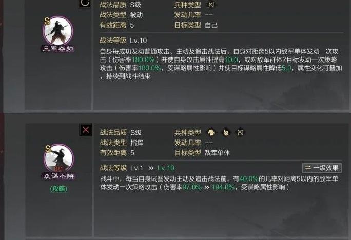 众谋战法有效距离为5,每回合可触发两次判定,发动概率40%,对单体造成194%伤害。若处于混乱或犹豫状态,则当回合无法进行判定,且无其他附加效果。
