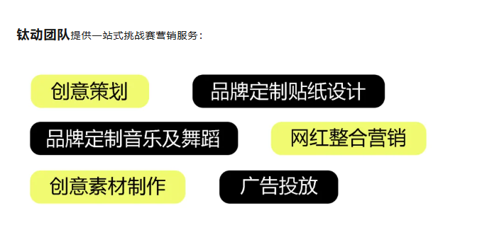 钛动科技基于对TikTok平台生态的深度理解,构建了涵盖创意策划、资源整合与效果优化的全链路挑战赛解决方案。该体系以品牌定制创意为核心,通过专业贴纸设计、专属音乐制作与标志性舞蹈编排,打造具有高度辨识度的品牌内容资产,确保品牌元素与挑战赛玩法的深度融合。