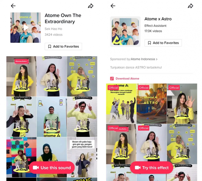 在服务亚洲领先的先享后付平台Atome时,钛动科技巧妙地借助平台代言人韩国超人气男团ASTRO的明星效应,在印尼市场打造了一场现象级的"共舞"挑战赛。团队精心设计了简单易学的舞蹈动作,精准戳中印尼受众兴趣点,同时搭配定制动态贴纸,将ASTRO视频与品牌icon动效完美融合,大幅降低了用户的参与门槛。